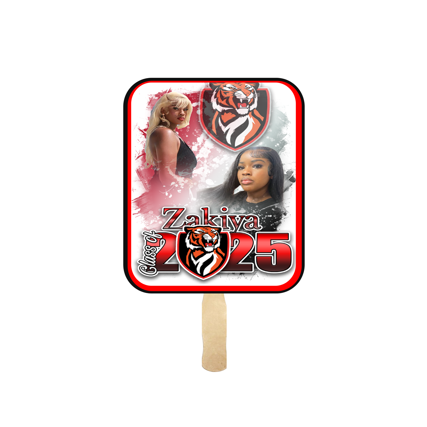 Imagine a custom graduation fan with a bright, bold design featuring the graduate's name and the year “2025” in large, elegant font. The background might be a blend of the school’s colors, with subtle accents of gold foil. The center could feature an illustration of a graduation cap with a tassel, and the handle could be made of polished wood with the graduate's initials etched into it. On the reverse side, there’s a personal message or quote, adding a sentimental touch. The entire fan is both functional and beautiful, perfect for keeping cool while celebrating a monumental achievement.